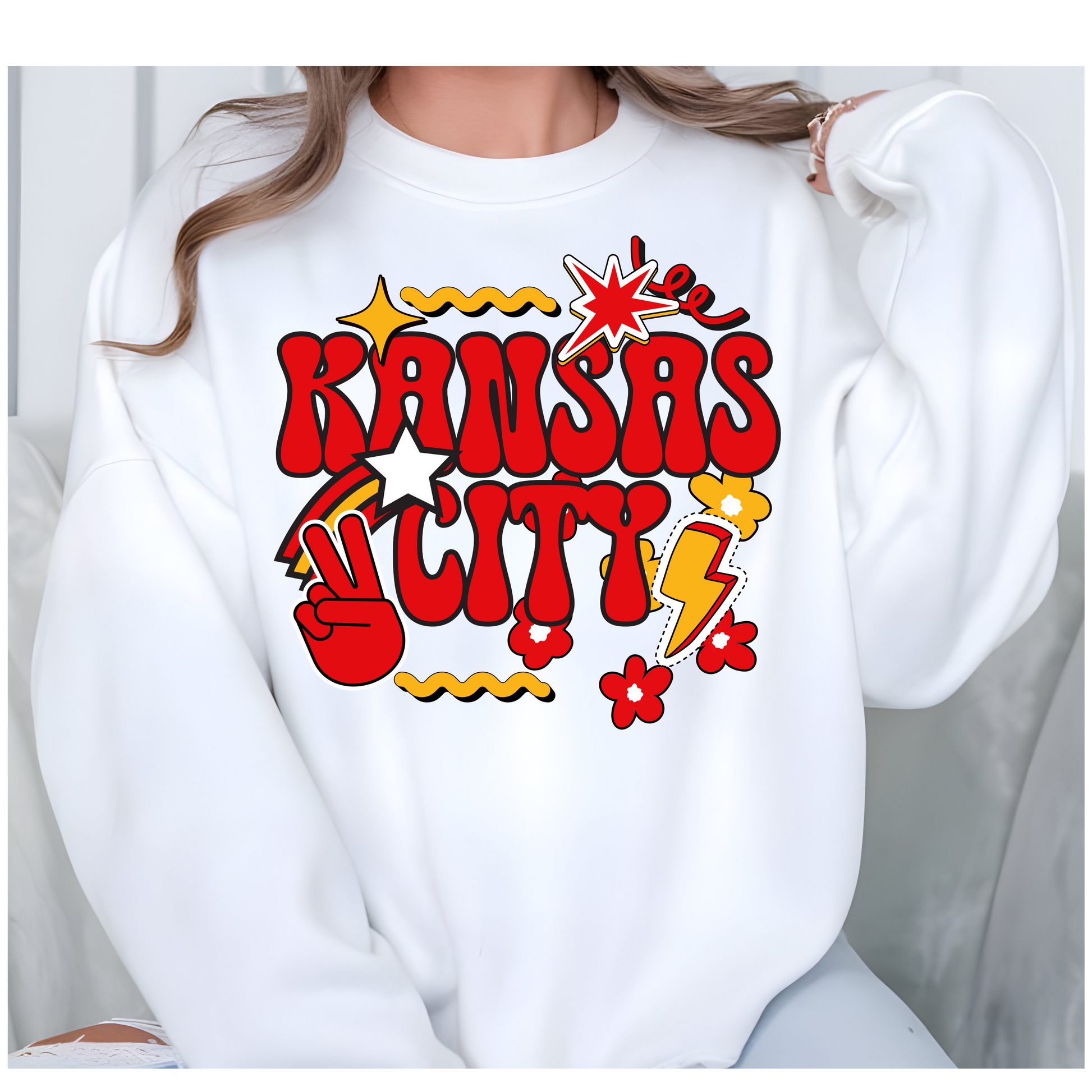 Step back in time with this groovy Kansas City crewneck! πΆ Featuring bold retro lettering, funky florals πΈ, lightning bolts β‘, and a peace sign βοΈ, this sweatshirt is a total vibe. Perfect for repping your KC pride in cozy style! ποΈβ¨ Made with ultra-soft fabric to keep you warm and comfy on all your adventuresβwhether you're tailgating, strolling the Plaza, or cheering on the home team! π